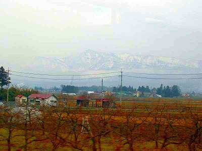バスの運転手にほら、見えるでしょうと、指さされて何の事かわからなかったのが、鳥海山。彼は、私がけげんそうな顔をしていることがかえって不思議だったようで、地元ではそれくらい親しい山なんですね。残念ながら雨のため、山頂付近は隠れて出てきません。その南には、これも教えてもらった、月山。羽越線からこの山並みを見ると、山の中腹より上はまだ雪景色。