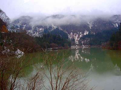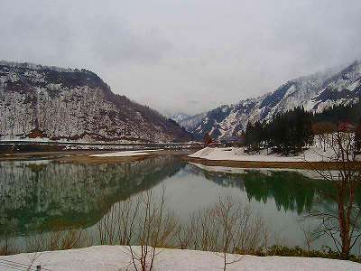 只見を過ぎると長い長いトンネル。この付近は、六十里越という街道の難所。今でも平行する国道252号線は冬季通行止め。このために只見線は廃止されずに残っていると聞きます。鉄路はこの峠を田子倉トンネルで越えます。きつい勾配をゆっくりのぼり、ふっとエンジンの音が静かになったかと思うと、トンネルを出る。出たところは急流が真ん中のほんの一部分だけ水の姿を見せ、あとは雪に覆われつつきびしいカーブを描きながら流れる。そしてその直後スノーシェッドで風景はかき消され、田子倉駅に停まります。この駅はシェッドの中にあって薄暗く、気味が悪いですよ。だれも降りない。だれも乗らない。