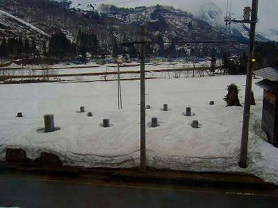 お墓が顔を出す雪の原。 会津大塩を過ぎて右、たぶん松ノ湯という温泉だと思います。古い作りの家が見え、その庭に立った煙突のような筒から温泉がごぼごぼ吹き出していました。一度泊まってみたいけれど、どうやって来るかが問題。