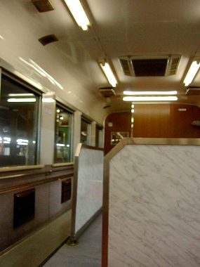 さあ、後は列車に乗るだけ。松山駅に付属の店で生ビールをぐびぐび飲みながら、この文章をまとめます。帰りは座席のグリーン車。こっちのほうがカーペットなどより断然いいかな、と思います。足を受けるための台がついており、かなり深くまでリクライニングします。うんうん、ここでなら楽に寝られるわい。おまけに三列シート。行きもこれにしておけば良かったとほぞをかみます。ところで松山から乗車したのは自分を含めて四人。次の伊予西条から一人乗り込んできて五人。がらがらのまま汽笛が鳴り、汽車はがったんと走り出しました。