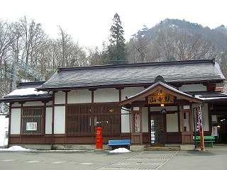 北上を出た列車は、午前中に越えてきた奥羽山脈の中にまた入って行きます。みるみる雪深くなるのがわかります。これで横手乗り換え秋田まで行くと、3時半ごろには秋田に着いてしまいます。しかし、この雨の中、そんな時間に着いても散策ができないだろうから、途中下車。駅に温泉があるということで有名な「ほっとゆだ」駅です。次の列車まで約3時間近くを、この駅の温泉で過ごすのもきついだろうから、バスに乗って湯本温泉へ行きましょう。ちょうど列車到着に合わせてダイヤが組んであるみたい。ほとんど待つ事なく、3人の乗客を乗せたバスは出発です。