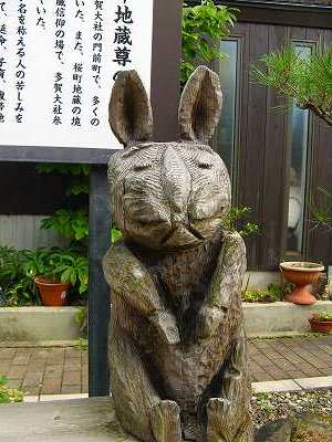 参道で見かけた風景。地蔵尊のほこらの前に置いてあったベンチにうさぎさん。ちょっと考え事。