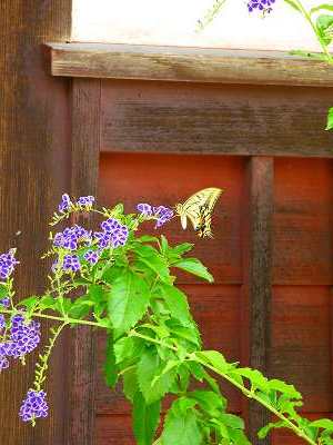 古い家の玄関先に蝶が舞い降りた。 右 古寺と青い空。