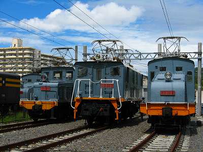 ここの展示ではとくに、電気機関車が印象的でした。私のあやしい記憶によると、小学校時代には、まだ大阪の南海電車には貨物が走っていたはずです、その貨物列車を引いていたのとおんなじような形の機関車が何両も静かに余生を送っています。型が同じものなのかどうかは詳しくないのでよくわかりませんが、こんな形で緑色の機関車が南海本線を走っていたはず。なつかしいです。(後で調べてみると、形は似ていても別物でした。)