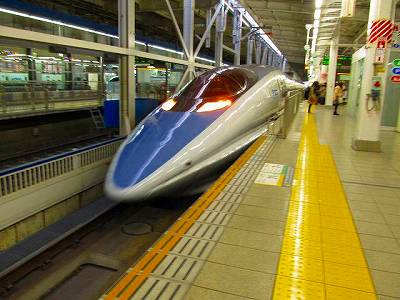 翌朝7時。博多駅ホーム。今日は山陰地方を通り抜け、富山まで行ってしまいます。二日目最初の乗車は7:17分発「こだま732号」岡山行き。約二十分後に出るのぞみでも間に合うのだけれど、この列車は「500系」で運転されると時刻表が申しております。1997年にこの500系が登場したときには、初めての時速300キロ運転だともてはやされたのですが、あっという間に過去の車両になってしまいました。速く走るための技術を惜しみなく使って登場したのに、それがあだとなり、ほかと形が違ってしまう。結果、一両あたりの定員が少し少なくなってしまったり、乗降口が一部分だけなかったりと、特殊。となると、席を予約するときにはほかの車両とは区別しなければならないし、ダイヤが乱れたときにほかの系統の代替となれる汎用性に欠けていたわけです。で、デビューからたったの13年で東海道新幹線から姿を消し、今はほそぼそと山陽新幹線「こだま」として生きながらえている。