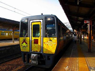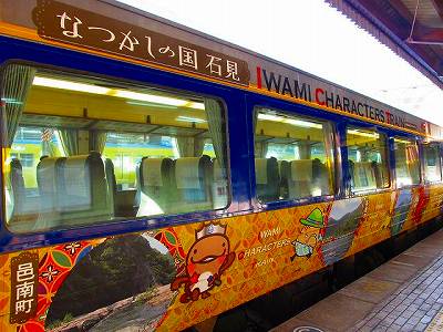 山口線のホームに、盛大なエンジンの音を響かせてやってきた特急「スーパーおき」。島根各地のゆるキャラが描かれた、派手な外装をまとっています。前からこの車両に乗りたかったんですよ。