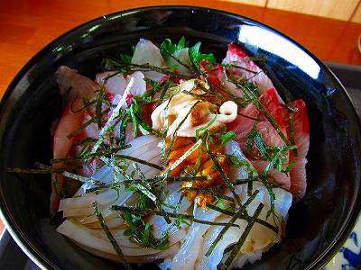 昼食は、海鮮丼特上を奢ってみました。ヨコワ、サバ、ヒラメ、ノドグロを炙ったもの。とりわけ、ノドグロの炙りは本当においしかった。炙った香ばしい香りと、ほの甘くてまったりとした濃い味わい。独特の風味。この丼、いろんなお刺身がご飯の上に分厚い層をなしていて、わざわざ降りた甲斐があったというものです。