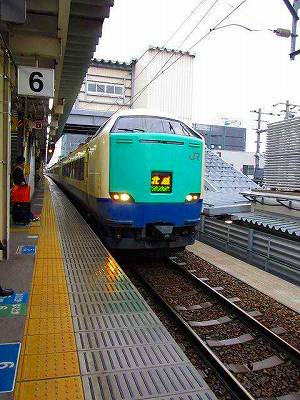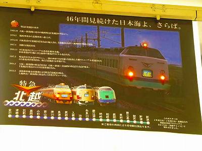 さて、再び糸魚川。富山方面ゆきの特急を待っていると、なにやら緊迫した声でアナウンスが何度も聞こえてきます。人が集まりすぎたので、記念入場券に並ぶ場所を変更するらしい。北陸新幹線開業に合わせた入場券でしょうか。そういや、さっき跨線橋を渡るときに大勢の人が行列してましたっけ。そちらの熱気をよそに、長大なホームは閑散としています。ここで金沢行特急「はくたか」に乗車。今まで東京から金沢方面というと、上越新幹線で越後湯沢まで行き、そこからこの在来線特急「はくたか」で、というのが普通でした。この列車も新幹線開業と同時に、その役目を終えて、在来線を走ることはなくなってしまうのでした。