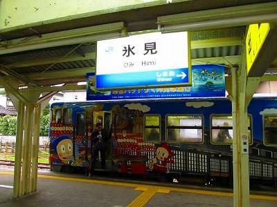 さて、明治時代に建てられた、雰囲気満点の城端駅で折り返して、また高岡駅へ。ここで、氷見線に乗り換え。今度は内陸から海の方へ向かいます。この列車、忍者ハットリくんのはではでラッピングがほどこされていて、車内アナウンスも忍者ハットリくん担当。沿線の紹介に余念がありません。なんでも、藤子不二雄AがFと出会った小学校はこの近くだとか、二人の高岡高校時代の話だとか。なるほどここは藤子不二雄の地元でしたか。そんな風変わりなアナウンスを聞きながら乗っていると、途中の高岡市街地からどんどん乗車してきてほぼ満員。休日を楽しんだ人たちの賑やかなおしゃべりで車内は満たされます。終点氷見まで混雑。この辺は万葉の昔から海運の中心として、また、越中の国府として栄えたんですニンニンとハットリくん。氷見駅でとんぼ返り。おり悪しく降りだした雨がばしゃばしゃ打ちつけて、本当なら海越しに立山連峰が輝いているはずの氷見湾を眺めつつ、再び高岡に戻り、今回の旅の終着駅京都を目指して、再び特急サンダーバードのグリーン車に身をあずけたのでした。