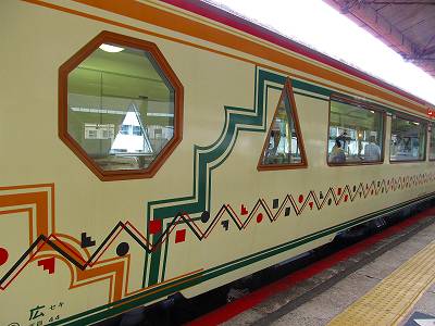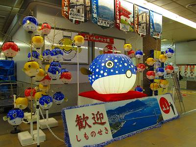 下関はふぐ(こっちではふくというんでしたっけ)の町。たくさんのふくがお出迎え。そしてまた、童謡詩人金子みすずとも縁が深い町。これから乗る「みすず潮彩」はそこから名前を取ったようです。古いディーゼルカーを改造して、ちょっと洒落た雰囲気。武井武雄の絵本に出てきそうな列車に仕上がっています。