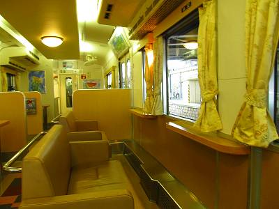 指定席はすべて海が見えるように、進行方向と平行になっていて、コンサートホールのように段違いになっているから山側の人もちゃんと海が見渡せるようになっています。