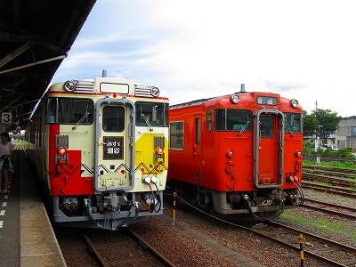 さて、北陸、山陰、どちらに向かう?こんなときは、通りにくい、一番の難所から攻めていくのが定石。まず、新下関から山陰線を回って長門市まで行く、「みすず潮彩」。これが、土日しか運行なし。ということは、出発の日曜に乗ってしまわないといけません。次の難所は「三江線」。島根県江津と、広島県三次を江の川に沿って結ぶこの路線、どちらから出発しても、朝6時ごろの一番列車に乗り逃がすと、次はもう終着が日暮の後という、あまりにもさっぱりしたダイヤ。まだ、三次からの方が、途中の石見川本駅で一時間四十分待てば、夕方には江津に着けるのが朝9時台に一本あるだけましと言えばまし。しかし、これにするともう、三江線だけで貴重な一日が終わってしまいます。ちょうど山陰線を走る「みすず潮彩」で江津に近づいたのだから、江津近辺に宿を取って江津発朝6時。これに決まり。