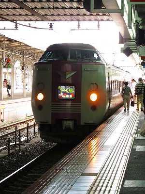 もうがっかり。なぜって、普通の車両だと、一番前の席はただただ壁に対面。落差は大きい。反対側に陣取ったカップルは、アジア系で英語を喋っていますが、やはりパノラマを狙っていたようで、ちょっとがっかりしている様子。やれやれ、本日昼からはついてないねえ。でもまあ、仕方がない。諦めが肝心。と口では言いながら実際はなかなか諦めがつかず、反芻しておもわず舌打ちしてしまったり。中国山地を横断して米子に向かう伯備線は、右に左にカーブの連続。で導入されたのがこの振り子電車。ただ、これ、国鉄時代から走っているものなので、最新鋭のものと比べると少し機能が荒っぽく、ために独特の揺れがあって評判があまりよろしくないのです。カーブに差し掛かるとその遠心力で、コロに乗った車体がぐらりと傾きます。普通の列車に比べて傾きが大きくなるから、カーブを早く走れるという寸法なんですが、カーブを曲がり始めた少しあとで車体が傾くという、この時間差が気持ち悪い。新しいのはこの時間差をなくしてあるので、振り子車両であっても気にはなりません。私は鈍感なので、多少揺れがひどくてもOK。うねうねと中国山地を横切って平地に出、右手に大山が姿を表すとほどなく山陰本線と合流、針路を西に変えて米子に着きます。18:16、定刻の到着。