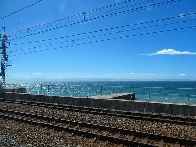 城崎温泉、和田山と停まるたびに急激に乗客が増えて播但線に入るころには自由席はほぼ満席。姫路から山陽線に入り、がんがん飛ばします。たまたま隣に誰も乗ってこなかったので淡路鳴門大橋や、須磨の海などゆったりと楽しみます。