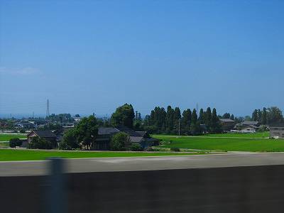 いままで、新幹線の旅をぼろくそにけなしてきましたが、このあたり、なんとか許せる範囲かな、なんて軟化の気配を見せ始めてしまいます。なにせ、車窓風景がいいんですよ。前の「おとなびパス」でも書きましたが、この辺の家は、みんな風から家を守るために、子供が生まれると家の周りの屋敷森に木を植える習わしがあるそうで、鬱蒼とした木々が家を取り巻いて、そんな家々が見渡す限りあちこちに偏在。ちと速すぎるとはいえ、風景がいいんですよ。
