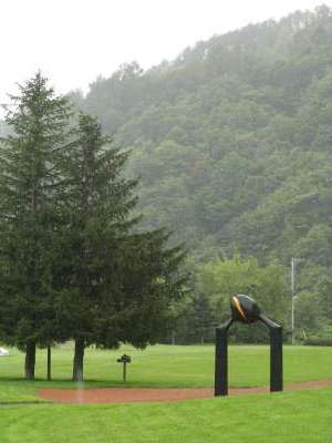 車が多くて楽しめない幹線道路を北上しますと、美唄市。炭鉱で栄えた街です。最初から北海道に来ると決めていたなら、炭鉱の遺産が網羅されている本を持ってくるんだった。昨年、一昨年と、九州の炭鉱地帯や夕張を訪れて、炭鉱にはいろんな意味でとても興味があるんです。この付近にまだかつて栄えていたころの遺産がいっぱい残っているはずなんですが。今回私をとらえたのは「アルテピアッツァ美唄→」の看板。おお、これも遺産の一つと言っていいか。ここ、つい最近、偶然テレビで見たことがあるんです。廃校になった小学校の敷地全体を、安田侃という地元出身の芸術家が一つの大きな作品に仕立て上げているという場所だったんじゃないかな。まさか実際に来るとは思ってませんでした。もちろん行ってみます。国道から山の方、たぶん、昔は炭坑があった方に十数分走ると到着。雨なので訪れる人も少なく、合羽姿でゆっくり見て回ります。