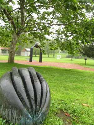 私は裏側から入りましたが、多分、正門から入ってくると、最初の門に突き当たります。何かが芽吹こうとしているようなこの作品は写真で見ていただくとして、その延長線上には二本差しフォークの柄を取ったのを突き立てたようなもの、その先にもコの字型を左に90度回して立てたようなもの。それらを結ぶ線の回りに曲面でできたいろんなオブジェ。実は建物の二階から見ると、それらをつなぐ道があって、その脇には真っ白い石を敷き詰めたまあるい池があるんです。