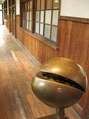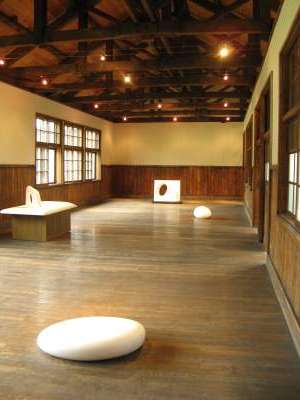 こりゃあおもしろい。元教室をうまく使ってこの通り。見る角度によって、あるいはオブジェのまんなかに開いた穴から覗いてみると、風景がどんどん変わります。この人の作品はなんだかほっとさせてくれるようなものが多い。古い木造校舎の雰囲気もてつだって、とても居心地のよい空間が広がります。ああ、教室の後ろ、カバン掛けだったところでしょうか、昔ここを使っていた子供の名前シールがまだそのまま。彼らは今どんな人生を送っているのでしょう。1981年閉校。昔と今との接点。