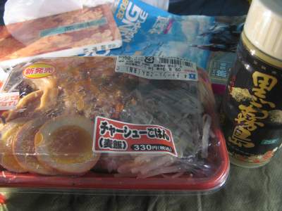 今日は疲れました。富良野では雨が止んだものの、何度も立ちごけするし(実は、このキャンプ場でも・・・停めようとして地面がぐにゃぐにゃだった・・・一日に三回も!) さて、恒例今日の夕食。上富良野のコンビニで仕入れた弁当。これを肴に一人で一献傾けて一日終了。もう風呂にはいるのもめんどくさいから省略。