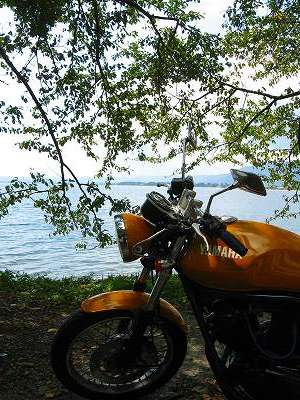 鯖街道と旧朽木村で別れ、針路を東へ。田舎道をずっと降りて行くと、なんだか日本離れしたような広さのたんぼが左右にぐうんと広がり、いっせいに稲穂が頭をたれて金色に輝く中を、稲の匂いを胸いっぱいに吸い込みながらまっすぐ走ると、ほどなく琵琶湖に突き当たります。琵琶湖の回りには「湖岸道路」というのが国道とは別にあって、多くの区間で琵琶湖を眺めながら走れるようになっています。その湖岸道路を北へ向かいます。安曇川から新旭のあたりですね。今は合併して高島市になっているのかな。ちょうどここで出発から1時間半くらい、休憩の時間です。