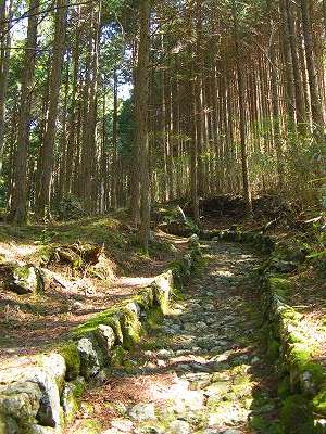 ちょうど20分ほど登っていくと、さっき別れた国道が行き止まりになっている地点のすぐ下を通り、石畳の道はだんだん普通の山道に変わっていき・・・ぐんと傾斜を強めたと思うと、とうとう峠。