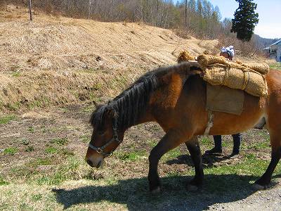 とにかく栂池の集合場所(ここがゴールでもあります)からシャトルバスがどんどん人々を運んで来る来る来る。その中に埋もれながら古い街並みを南へ歩き始めます。上り坂で道が険しくなってくるとありの行列よろしく一列になってえっちらえっちら。昔のいでたちで歩くコンテストも同時にやっているようで、いろんな格好の人が一緒に歩いています。しまいには荷物をしょった馬まで。