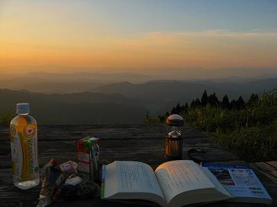 日がくれる前にキャンプ場につくことができました。先客が一組だけ。どっかに出かけている様子。さっきの風景を独り占め。さっさとテントを設営して、テーブルに好きなものを並べ、持ってきた本を読みます。ふと目をあげると、ちょうど西の空が橙色に染まりはじめ、刻々と表情を変えながら茜色に沈んでいきます。気づくとそこには深い闇の向こう側に街の明かりがきらきら。思わず息を詰めて見入ってしまいます。