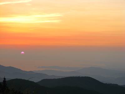 目の前に広がるのは、見渡す限りの山、山、その間にほんの少し開けて平らになった所、そこにはちっちゃな田んぼ。そしてまた山、山。視線を上げていくと、しまいには山なのか雲なのかわからなくなって茫々たる空。山は所々しわがよったように高くなったり、ぎざぎざ模様を見せたりしながら、目の前いっぱいに広がっています。左の方に視線を移せばそのきらきら光っているのは海でしょう。その海の向こうに島が見えます。山だ海だと名前をつけて呼んでいるけれど、実はみんなつながっていて一つなんだということがすとんと納得できるような光景です。