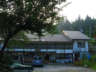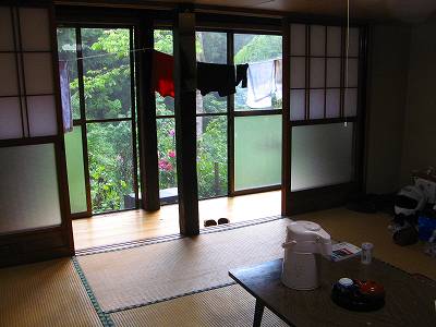 風呂から上がって居間に一人あるじの帰りを待ちます。部屋の真ん中にちゃぶ台が置いてあって、神棚がまつられており、息子さんがもらったたくさんの賞状が誇らしげにかかげてある、まさに典型的な田舎の居間。そんな郷里の家に帰って来たようなくつろいだ雰囲気の中で待ちます。これはこれでおもしろい経験かな。まだ雷雨に濡れた荷物は玄関に出しっぱなしだし。風呂から上がって、先ほどの居間でまたぼんやりしていると、宿のご主人が帰ってこられます。案内された部屋は、片側が隣の部屋と襖でしきられているだけ、もう一方は湯治の宿によくあるように、引き戸を開けるとそこは廊下。廊下にはタオルとか衣類とかいろんなものがぶら下がっており、これまた湯治の宿に来たのだと感じさせられます。干し物の向こう側は素朴な花が咲いている庭。廊下側の引き戸を開けはなして、ひぐらしのすだきやうぐいすのさえずりを聞きながら寝そべって本を読んでいると、これが至福。これまた一泊じゃもったいない。宿で出会った客人も、年に四回くらいはここにきているということでした。