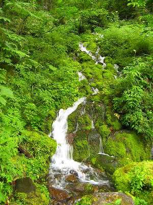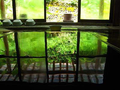 三つある浴槽には、神社の方からやってくる源泉の流れが分岐して入るようになっていますが、それぞれの分岐点に、マッチ箱を二つ重ねたくらいの大きさの石を置いて、湯船に入る源泉の量を調整しています。源泉の温度が高いので、たくさん注いである浴槽は熱くて私には無理。真ん中の温度のも、湯船の中で少しでも体を動かすと熱くてどうしようもない。動かずにじいっと座って大地の力を吸収。ちょうど浴室の前を流れている沢の音がさらさら聞こえてきて、しんと静まり返って鏡のようになった湯のおもてが、沢の緑を反映してとても気持ちがいいのです。このあと何度も何度も入りにきました。皮膚が柔らかくすべすべになります。そしてとてもあたたまります。これは一泊じゃもったいない。