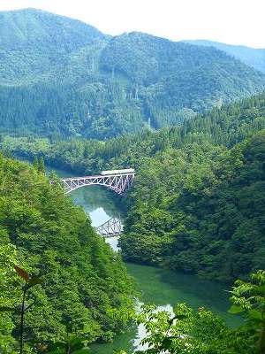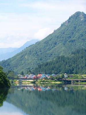 さて、只見町でした。只見川にそって開けた所。新潟と会津を六十里越えや八十里越えなどという、聞いただけで怖気づいてしまうような街道でつないでいた交通の要衝です。八十里越えの方は現代でもまだ車が走れる道はありません。町が川に映り込んで、いい感じ。上下三本ずつの列車が止まる駅は、観光案内所も兼ねていて、車で次々に観光客が訪れています。ここは会津なんだけれど、中心地会津若松までは二時間はかかる、ところが新潟県側だと一時間少しで行ける。だから医者なんかに行くのは新潟方面だよと、案内の人が話しているのが聞こえてきます。