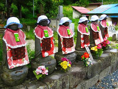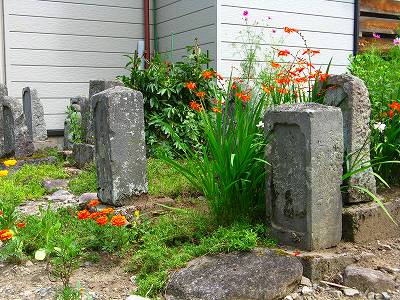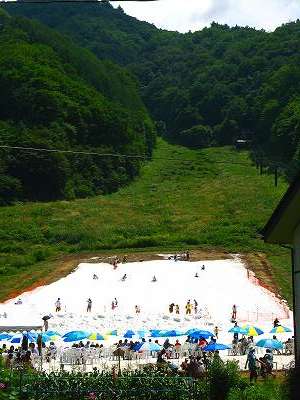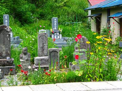 ちょうど昼過ぎ、やっと檜枝岐村に入りました。人口は700人に満たないはずなのに、えらく人が集まっています。この一帯は日本有数の豪雪地帯、冬の間に積もった雪にシートをかけておき、その雪で遊ぶ「真夏の雪祭り」だそう。小さな人工スキー場よろしく傾斜地に雪がしかれ、子供たちが群れ遊んでいますよ。きゃーきゃーと歓声がひっきりなし。そこを過ぎるといよいよ村の中心部。両側を山にはさまれてその谷底をつらぬく国道に沿って大きな役場があって、家々が続いたかと思うと、その間にはお墓(ここでは廟所と呼ぶのだそう)。そうそうこれも聞いていたとおり。普段生活している家のすぐ近所にお墓を作る習わしだそうで、しかもその敷地には色とりどりの花が咲き乱れているんですよ。家並みと墓所を分ける区別がはっきりしていないのが印象的。