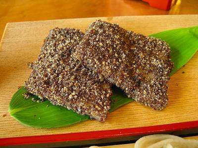 ところで、廟所に見とれているうちに、お腹が空いてきます。これも自然のながれ(笑)。やはり廟所と同じ並びに何軒かある、名物の蕎麦を食べることにしましょう。なぜ名物かといえば、ここは今でもそうらしいのですが、お米がとれないのだそう。だから昔から蕎麦を植えてそれを食べてきたらしいのです。普通は蕎麦のつなぎに小麦粉を使うのですが、小麦も取れないので蕎麦粉だけで打った、十割そば、別名「裁ちそば」をいただきましょう。「ハットウ」という名物も一緒になった定食を注文。つなぎを入れないと蕎麦生地を折り曲げたときにちぎれてしまうので、薄い生地を折り曲げずに何枚も重ね、布を裁つように裁つから「裁ちそば」。冷たく締められたそばはこりこりとした感触が楽しいものでした。そして始めて食べる「ハットウ」。これは素朴なお菓子といっていいんでしょうか、蕎麦粉ともち粉(昔は使わなかったらしい)を丸めてエゴマと砂糖で味付けしたひらべったい団子のようなものです。さる貴人にこれを差し上げたところ、あまりにおいしいから村人が食することを「御法度」にしたところからきた名前だとか。たしかにほんのりとした甘さの中にそばの香りがたつ様子はすばらしい。けれど、おいしいからってなんで村人が食べるのを禁じたのか、なんか変じゃないですか?