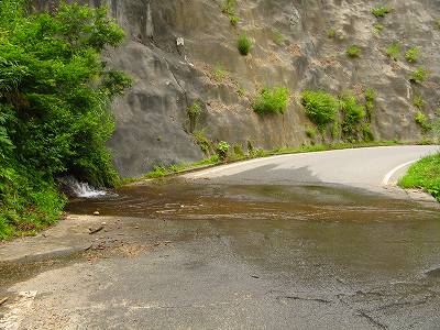 おっともう2時を回っている。本当は資料館をゆっくり見て街中も、のんびり歩きたかったのだけれど、ここから県境を越える峠道は、今回のツーリングで最強の厳しい道になるはず。国道なのに、数年前まで二輪車の通行が全面的に禁止されていたところなんです。ここ檜枝岐村は福島県の南の端、栃木、群馬、新潟の三県と接しています。そのまま南下すれば尾瀬沼を抜けて群馬県の片品村。でも尾瀬を突っ切ることになるので、もちろん車の通行はできません。折り重なった山々を越えて西へ抜ければそこは新潟県魚沼。こちらは車で越えてゆけますが・・・いやあきつかった。これでもかこれでもかという急カーブと急坂。道幅は車同士だとすれ違いできないような所もところどころ。しかも、普通なら道路の下に溝を掘って流す沢の水を、そのまま道路に流しているところが多くて、滑らないように気を遣います。